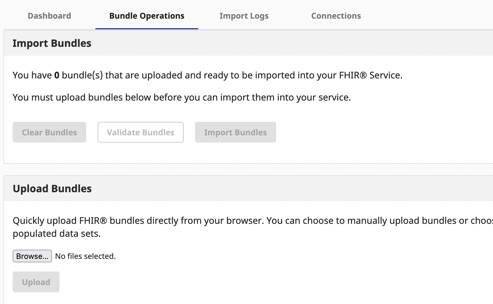 Depending on the project you have in mind, you might need some sample patient data in your storage. Once deployment is created and running, click on it and go to "Data Management" menu, and select "Bundle Operations" tab. This is where you can populate your server with sample patient databases, from relatively healthy patients to ones having specific health issues like Arthritis, Covid or Allergies.